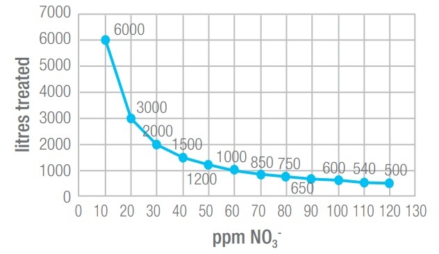 За законом концентрація нітратів у питній воді не має перевищувати 50 мг/л. Протинітратні картриджі доступні заввишки 10" з номінальною рекомендованою пропускною здатністю до 110 л/год. Пригідні для питної води. Картриджі, заповнені сильною аніонною смолою для зниження вмісту нітратів.
